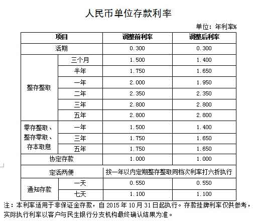 人民币存款利率调整(2016年8月1日起执行)