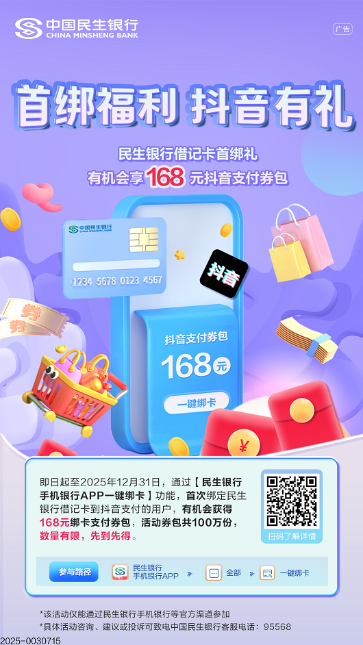 抖音首次绑定欧美av 卡有机会享最高168元抖音支付券包
